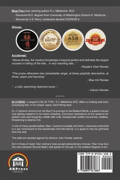 IN HYBRID, a sequel to BLUE FIRE, R.J. Mikelionis M.D. offers a riveting and even surpassing tale, in his unique, spare, hard-hitting style. Dr. J. Cameron returns from his Blue Fire journeys to the Medical Wards, a superb clinician now adding research to his hectic schedule. Enormous implications of the research for patient care and longevity collide with cold, bureaucratic politico-economic realities, threatening to destroy him. In one of many parallel battles, Max-Cameron's buddy and Intern-becomes embroiled in a war reminiscent of the backstreets he'd left behind, in a quest to free his girlfriend from the mob. The odds are stacked against the doctors, their friends, patients. But in times of need, their ordinary lives accept extraordinary choices. Their lives lock into wars between life and death, and quests for the just vs. the shadow dragons of evil.