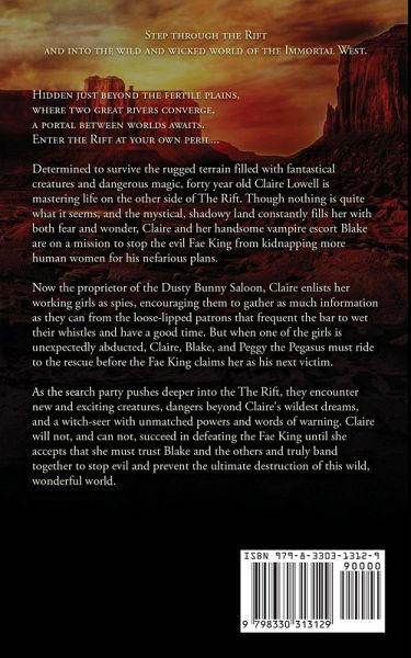 Step through the Rift and into the wild and wicked world of the Immortal West. Hidden just beyond the fertile plains, where two great rivers converge, a portal between worlds awaits. Enter the Rift at your own peril... Determined to survive the rugged terrain filled with fantastical creatures and dangerous magic, forty year old Claire Lowell is mastering life on the other side of The Rift. Though nothing is quite what it seems, and the mystical, shadowy land constantly fills her with both fear and wonder, Claire and her handsome vampire escort Blake are on a mission to stop the evil Fae King from kidnapping more human women for his nefarious plans. Now the proprietor of the Dusty Bunny Saloon, Claire enlists her working girls as spies, encouraging them to gather as much information as they can from the loose-lipped patrons that frequent the bar to wet their whistles and have a good time. But when one of the girls is unexpectedly abducted, Claire, Blake, and Peggy the Pegasus must ride to the rescue before the Fae King claims her as his next victim. As the search party pushes deeper into the The Rift, they encounter new and exciting creatures, dangers beyond Claire's wildest dreams, and a witch-seer with unmatched powers and words of warning. Claire will not, and can not, succeed in defeating the Fae King until she accepts that she must trust Blake and the others and truly band together to stop evil and prevent the ultimate destruction of this wild, wonderful world.