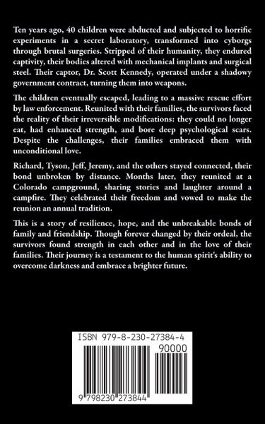 Ten years ago, 40 children were abducted and subjected to horrific experiments in a secret laboratory, transformed into cyborgs through brutal surgeries. Stripped of their humanity, they endured captivity, their bodies altered with mechanical implants and surgical steel. Their captor, Dr. Scott Kennedy, operated under a shadowy government contract, turning them into weapons. The children eventually escaped, leading to a massive rescue effort by law enforcement. Reunited with their families, the survivors faced the reality of their irreversible modifications: they could no longer eat, had enhanced strength, and bore deep psychological scars. Despite the challenges, their families embraced them with unconditional love. Richard, Tyson, Jeff, Jeremy, and the others stayed connected, their bond unbroken by distance. Months later, they reunited at a Colorado campground, sharing stories and laughter around a campfire. They celebrated their freedom and vowed to make the reunion an annual tradition. This is a story of resilience, hope, and the unbreakable bonds of family and friendship. Though forever changed by their ordeal, the survivors found strength in each other and in the love of their families. Their journey is a testament to the human spirit's ability to overcome darkness and embrace a brighter future.