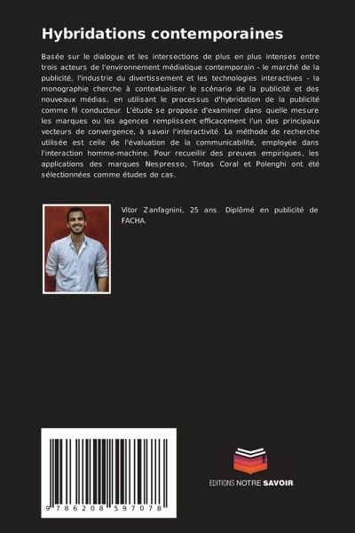 Basée sur le dialogue et les intersections de plus en plus intenses entre trois acteurs de l'environnement médiatique contemporain - le marché de la publicité, l'industrie du divertissement et les technologies interactives - la monographie cherche à contextualiser le scénario de la publicité et des nouveaux médias, en utilisant le processus d'hybridation de la publicité comme fil conducteur. L'étude se propose d'examiner dans quelle mesure les marques ou les agences remplissent efficacement l'un des principaux vecteurs de convergence, à savoir l'interactivité. La méthode de recherche utilisée est celle de l'évaluation de la communicabilité, employée dans l'interaction homme-machine. Pour recueillir des preuves empiriques, les applications des marques Nespresso, Tintas Coral et Polenghi ont été sélectionnées comme études de cas.