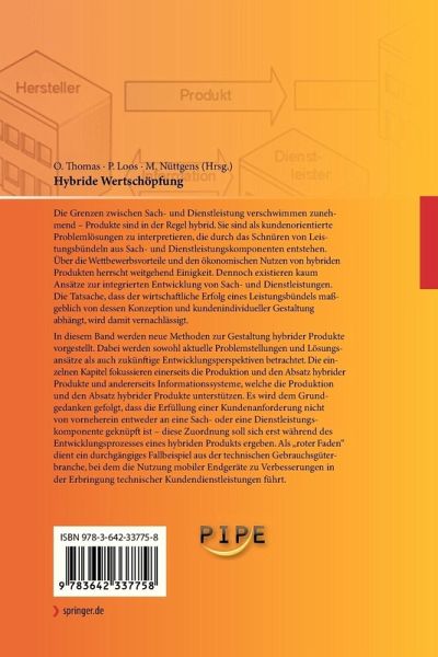 Grundlagen und Anwendungsszenarien.- PIPE - Hybride Wertschöpfung im Maschinen-und Anlagenbau.- Technische Kundendienstleistungen: Einordnung, Charakterisierung und Klassifikation.- Arbeitsformen und IT-Unterstützung im technischen Kundendienst: eine empirische Untersuchung am Beispiel der Sanitär-, Heizungs- und Klimatechnikbranche.- Methoden und Modelle.- Konstruktion und Anwendung einer Entwicklungsmethodik für Product-Service Systems.- Vorgehensmodelle des Product-Service Systems Engineering.- Lebenszyklusmodelle hybrider Wertschöpfung: Modellimplikationen und Fallstudie.- Modellierung technischer Serviceprozesse im Kontext hybrider Wertschöpfung.- Werkzeuge und IT-Unterstützung.- Integrierte Informationssysteme zur Unterstützung technischer Kundendienstleistungen.- Das INTERACTIVE-Serviceportal.- Evaluation und Entwicklungsbegleitende Normung.- Evaluation des PIPE-Informationssystems.- Entwicklungsbegleitende Normung im Kontext hybrider Wertschöpfung.- Kooperationen und Geschäftsmodelle.- IT-gestützte Wertschöpfungspartnerschaften zur Integration von Produktion und Dienstleistung im Maschinen- und Anlagenbau.- Geschäftsmodelle hybrider Wertschöpfung im Maschinen- und Anlagenbau mit PIPE.- IT-Unterstützung von Instandhaltungs-, Wartungs- und Reparaturprozessen: die Perspektive der SHK-Betriebe.