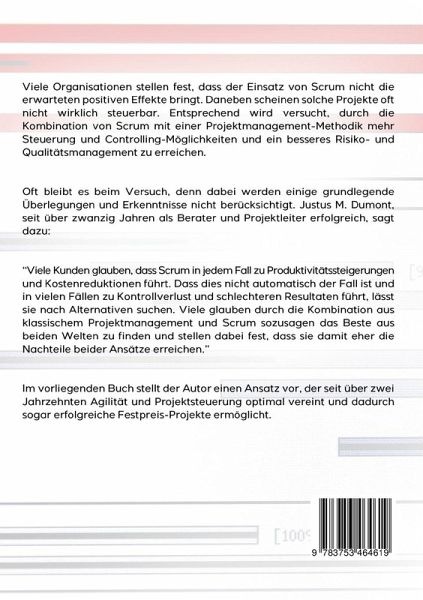 Viele Organisationen stellen fest, dass der Einsatz von Scrum nicht die erwarteten positiven Effekte bringt. Daneben scheinen solche Projekte oft nicht wirklich steuerbar. Entsprechend wird versucht, durch die Kombination von Scrum mit einer Projektmanagement-Methodik mehr Steuerung und Controlling-Möglichkeiten und ein besseres Risiko- und Qualitätsmanagement zu erreichen. Oft bleibt es beim Versuch, denn dabei werden einige grundlegende Überlegungen und Erkenntnisse nicht berücksichtigt. Justus M. Dumont, seit über zwanzig Jahren als Berater und Projektleiter erfolgreich, sagt dazu:"Viele Kunden glauben, dass Scrum in jedem Fall zu Produktivitätssteigerungen und Kostenreduktionen führt. Dass dies nicht automatisch der Fall ist und in vielen Fällen zu Kontrollverlust und schlechteren Resultaten führt, lässt sie nach Alternativen suchen. Viele glauben durch die Kombination aus klassischem Projektmanagement und Scrum sozusagen das Beste aus beiden Welten zu finden und stellen dabei fest, dass sie damit eher die Nachteile beider Ansätze erreichen."Im vorliegenden Buch stellt der Autor einen Ansatz vor, der seit über zwei Jahrzehnten Agilität und Projektsteuerung optimal vereint und dadurch sogar erfolgreiche Festpreis-Projekte ermöglicht.