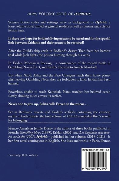 Science fiction codes and settings serve as background to Hybrids, a four-volume novel aimed at general readers as well as fantasy and science fiction fans. Hope, volume four of Hybrids Is there any hope for Eridan's living ocean to be saved and for the special link between Eridanis and their ocean to be restored? After the Guild's ship crash in Redland's desert, Theo faces her hardest trial while Jack fights the poison burning through his veins. In Eridan, Mocean is freezing - a consequence of the mental battle in Gambling Nova's Pit 3, and Keith's decision to launch Mindrule. But when Nand, Ashta and the Face Changers reach their home planet after leaving Gambling Nova, they are forbidden to land: Eridan has been banned. Powerless, unable to reach Kaipekak, Nand watches her beloved ocean slowly choking as ice covers its surface. Never one to give up, Ashta calls Farren to the rescue ... Set in Redland's deserts and Eridan's icefields, entwining the creation myths of both planets, the final volume of Hybrids concludes Theo's search for belonging.