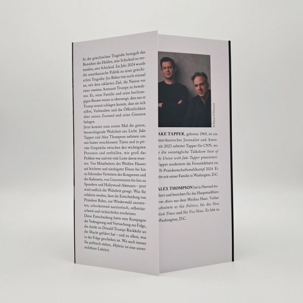 »Biden, seine Familie und sein Team haben sich von ihrem Eigeninteresse und der Angst vor einer weiteren Amtszeit Trumps leiten lassen, und deshalb versucht, einen zuweilen verwirrten alten Mann für vier weitere Jahre ins Oval Office zu bringen. Wie viele wussten davon? Was wurde vertuscht? War es eine Verschwörung?« Jake Tapper und Alex Thompson