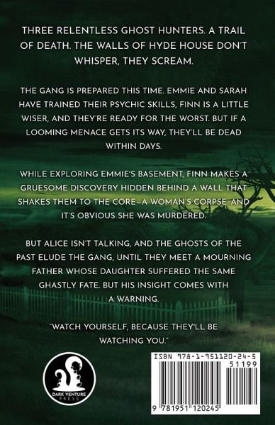 Three relentless ghost hunters. A trail of death. The walls of Hyde House don't whisper, they scream. The gang is prepared this time. Emmie and Sarah have trained their psychic skills, Finn is a little wiser, and they're ready for the worst. But if a looming menace gets its way, they'll be dead within days. While exploring Emmie's basement, Finn makes a gruesome discovery hidden behind a wall that shakes them to the core-a woman's corpse. And it's obvious she was murdered. But Alice isn't talking, and the ghosts of the past elude the gang, until they meet a mourning father who's daughter suffered the same ghastly fate. But his insight comes with a warning. "Watch yourself, because they'll be watching you." Driven to help the victims and find peace for Alice, they soon realize they've stumbled into a deadly game of twisted voodoo, and there's no turning back. Frantic to escape the expanding web of deception, they're forced to face their deepest fears within the quaint stillness of Hyde House. Hyde House is the third novel in a new Paranormal Mystery series that delivers an unsolved murder, ghostly mysteries, and a twist of horror. Fans of Wendy Wang, Darcy Coates, Abe Moss, Cheryl Bradshaw, or Heather Graham will love this exciting new supernatural suspense book. Other great books by Dean Rasmussen: Hanging House: An Emmie Rose Haunted Mystery Book 1 Caine House: An Emmie Rose Haunted Mystery Book 2 Dreadful Dark: Tales of Horror Book 1 - 6 Stone Hill: Shadows Rising 1 Stone Hill: Phantoms Reborn 2 Stone Hill: Leviathan Wakes 3 Or you can visit his website at: www.deanrasmussen.com.