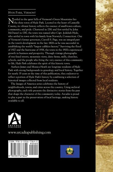 Nestled in the quiet hills of Vermont's Green Mountains lies the shire town of Hyde Park. Located in the heart of Lamoille County, its vibrant history reflects the essence of small-town culture, community, and pride. Chartered in 1781 and first settled by John McDaniel in 1787, the town was named after Capt. Jedidiah Hyde, who settled in town with his family from Norwich, Connecticut. One of Vermont's former governors, Carroll S. Page, was an integral part in the town's development in the late 1800s as he was successful in establishing the world's "largest calfskin factory." Surviving the flood of 1927 and the hurricane of 1938, the town in the 1900s experienced growth in business and prosperity. Through vintage photographs of tree-lined streets, mountain views, dairy farms, mills, churches, schools, and the people who bring the very essence of this community to life, Hyde Park celebrates the spirit of this historic town.