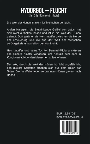 Hydorgol - Flucht(Teil 2 der Hünenwelt Trilogie)Die Welt der Hünen ist nicht für Menschen gemacht. Alofan Haragieri, die Bluttrinkende Geißel von Lotus, hat sich nicht aufhalten lassen und ist in die Welt der Hünen gelangt. Dort gerät er als Herr Imbrifer zwischen die Horde der Erneuerung und die aus der Welt der Menschen zurückgekehrte Inquisition der Kontinuität.Herr Imbrifer und seine Tochter Bammel-Midiana müssen das sichere Kloster verlassen, um Kontakt zu den im Konglomerat lebenden Menschen aufzunehmen.Der Weg durch die Welt der Hünen ist nicht ungefährlich, den düstere Schatten erheben sich aus dem Reich der Toten. Die im Weltenfeuer verbrannten Hünen gieren nach Rache ...