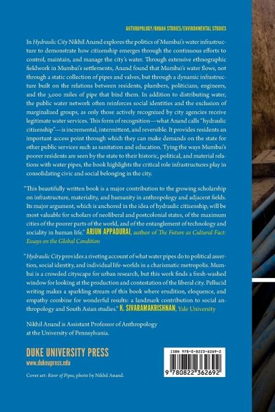 Nikhil Anand explores the politics of Mumbai's water infrastructure to demonstrate how citizenship and the rights through which to make demands on the state for public services emerges through the relations between residents, plumbers, politicians, engineers, and the 3000 miles of pipe that bind them.