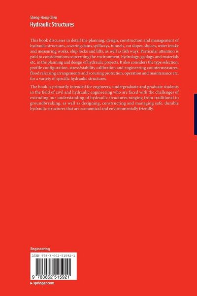 This book discusses in detail the planning, design, construction and management of hydraulic structures, covering dams, spillways, tunnels, cut slopes, sluices, water intake and measuring works, ship locks and lifts, as well as fish ways. Particular attention is paid to considerations concerning the environment, hydrology, geology and materials etc. in the planning and design of hydraulic projects. It also considers the type selection, profile configuration, stress/stability calibration and engineering countermeasures, flood releasing arrangements and scouring protection, operation and maintenance etc. for a variety of specific hydraulic structures.
