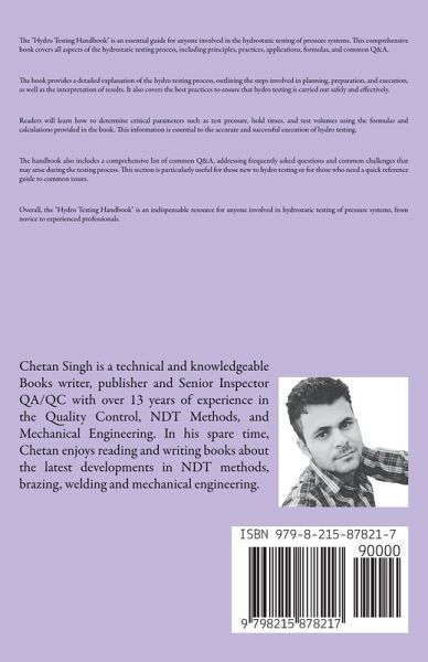 The "Hydro Testing Handbook" is an essential guide for anyone involved in the hydrostatic testing of pressure systems. This comprehensive book covers all aspects of the hydrostatic testing process, including principles, practices, applications, formulas, and common Q&A. The book provides a detailed explanation of the hydro testing process, outlining the steps involved in planning, preparation, and execution, as well as the interpretation of results. It also covers the best practices to ensure that hydro testing is carried out safely and effectively. Readers will learn how to determine critical parameters such as test pressure, hold times, and test volumes using the formulas and calculations provided in the book. This information is essential to the accurate and successful execution of hydro testing. The handbook also includes a comprehensive list of common Q&A, addressing frequently asked questions and common challenges that may arise during the testing process. This section is particularly useful for those new to hydro testing or for those who need a quick reference guide to common issues. Overall, the "Hydro Testing Handbook" is an indispensable resource for anyone involved in hydrostatic testing of pressure systems, from novice to experienced professionals.