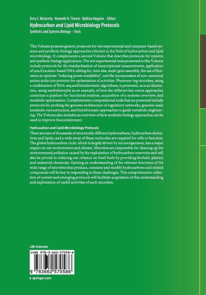 This Volume presents generic protocols for wet experimental and computer-based systems and synthetic biology approaches relevant to the field of hydrocarbon and lipid microbiology. It complements a second Volume that describes protocols for systems and synthetic biology applications. The wet experimental tools presented in this Volume include protocols for the standardisation of transcriptional measurements, application of uracil excision-based DNA editing for, inter alia, multi-gene assembly, the use of fluxomics to optimise "reducing power availability", and the incorporation of non-canonical amino acids into proteins for optimisation of activities. Phenome-ing microbes, using a combination of RNA-seq and bioinformatic algorithms, is presented, as is an illustration, using methylotrophs as an example, of how the different key omics approaches constitute a pipeline for functional analysis, acquisition of a systems overview, and metabolic optimisation. Complementary computationaltools that are presented include protocols for probing the genome architecture of regulatory networks, genome-scale metabolic reconstruction, and bioinformatic approaches to guide metabolic engineering. The Volume also includes an overview of how synthetic biology approaches can be used to improve biocontainment. Hydrocarbon and Lipid Microbiology ProtocolsThere are tens of thousands of structurally different hydrocarbons, hydrocarbon derivatives and lipids, and a wide array of these molecules are required for cells to function. The global hydrocarbon cycle, which is largely driven by microorganisms, has a major impact on our environment and climate. Microbes are responsible for cleaning up the environmental pollution caused by the exploitation of hydrocarbon reservoirs and will also be pivotal in reducing our reliance on fossil fuels by providing biofuels, plastics and industrial chemicals. Gaining an understanding of the relevant functions of the wide range of microbes that produce, consume and modify hydrocarbons and related compounds will be key to responding to these challenges. This comprehensive collection of current and emerging protocols will facilitate acquisition of this understanding and exploitation of useful activities of such microbes.