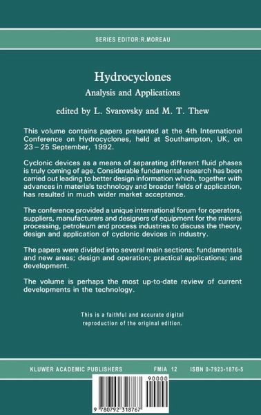 It is with great pleasure and satisfaction that we introduce this volume which comprises the papers accepted for the 4th International Conference on Hydrocyclones held in Southampton from 23rd to 25th September 1992. As the name implies, this is the fourth Conference in the series, with the previous ones held in Cambridge in 1980, Bath in 1984 and Oxford in 1987. The papers cover a wide span of activities, from fundamental research to advances in industrial practice and, as in the earlier volumes, make a significant contribution of lasting value to the technical literature on hydrocyclones. Hydrocyclones continue to widen their appeal to engineers; besides their traditional role in mineral processing they now attract a lot of attention in chemical engineering, the oil and gas industry, power generation, the food industry, textiles, metal working, waste water treatment, pharmaceuticals, biotechnology and other industries. The reason for this continuously increasing attention is, as David Parkinson (General Manager of Conoco (UK)) said recently, that" ... a hydrocyclone is an engineering dream, a machine with no moving parts." Yet as this Volume clearly shows, the hydrocyclone can do so many things and do them well, whether the application is in solid-liquid, liquid-liquid or liquid-gas separation.