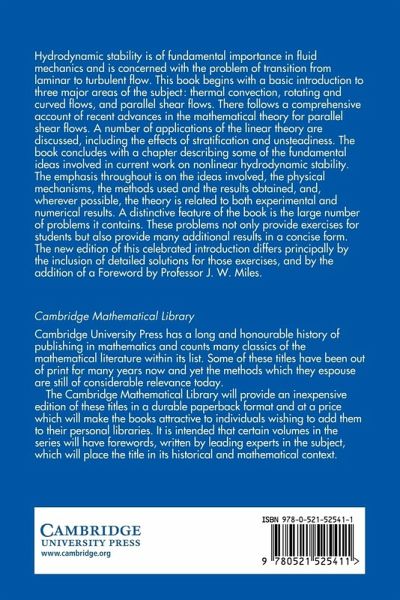Hydrodynamic stability is of fundamental importance in fluid mechanics and is concerned with the problem of transition from laminar to turbulent flow. Drazin and Reid emphasise throughout the ideas involved, the physical mechanisms, the methods used, and the results obtained, and, wherever possible, relate the theory to both experimental and numerical results. A distinctive feature of the book is the large number of problems it contains. These problems not only provide exercises for students but also provide many additional results in a concise form. This new edition of this celebrated introduction differs principally by the inclusion of detailed solutions for those exercises, and by the addition of a Foreword by Professor J. W. Miles.