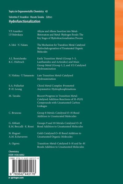 Valentine P. Ananikov, Irina P. Beletskaya: Alkyne and alkene insertion into metal-heteroatom and metal-hydrogen bonds - the key stages of hydrofunctionalization process.- Akihiko Ishii_ and Norio Nakata: The Mechanism for Transition Metal-Catalyzed Hydrochalcogenation of Unsaturated Organic Molecules.- A. L. Reznichenko and Kai C. Hultzsch: Early Transition Metal (Group 3-5, Lanthanides and Actinides) and Main Group Metal (Group 1, 2, and 13) Catalyzed Hydroamination.- Naoko Nishina and Yoshinori Yamamoto: Late transition metal catalyzed hydroamination.- Sumod A. Pullarkat and Pak-Hing Leung: Chiral Metal Complex Promoted Asymmetric Hydrophosphinations.- Masato Tanaka: Recent Progress in Transition Metal-Catalyzed Addition Reactions of H-P(O) Compounds with Unsaturated Carbon Linkages.- Christian Bruneau: Group 8 metals-catalyzed O-H bond addition to unsaturated molecules.- Giorgio Abbiati, Egle M. Beccalli, Elisabetta Rossi: Groups 9 and 10 metals-catalyzed O-H bond addition to unsaturated molecules.- Núria Huguet and Antonio M. Echavarren: Gold-Catalyzed O-H Bond Addition to Unsaturated Organic Molecules.- Akiya Ogawa: Transition-Metal-Catalyzed S-H and Se-H Bonds Addition to Unsaturated Molecules.