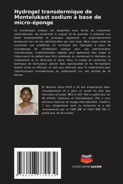 Le montélukast sodique est disponible sous forme de comprimés conventionnels, de comprimés à croquer et de granulés. Il présente une faible biodisponibilité et provoque également un engourdissement temporaire lors de son administration par voie orale. Nous avons tenté de surmonter ces problèmes en formulant des hydrogels à base de microéponge de montélukast sodique pour une administration transdermique. L'administration répétée peut également être évitée et l'observance du patient peut être améliorée en maintenant la libération du médicament et en diminuant la dose. Ainsi, le travail de recherche, la technique de formulation utilisée était reproductible et les formulations étaient sûres et efficaces en tant que véhicules pour le médicament pour l'administration transdermique du médicament sur une période de 24 heures.