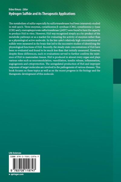 The metabolism of sulfur especially by sulfurtransferases had been intensively studied in mid 1900's. Three enzymes, cystathionine beta-synthase (CBS), cystathionine Gamma-lyase (CSE) and 3-mercaptopyruvate sulfurtransferase (3MST) were found to have the capacity to produce H2S in vitro. However, H2S was recognized simply as a by-product of the metabolic pathways or as a marker for evaluating the activity of enzymes rather than as a physiological active molecule. In the late 1980's relatively high concentrations of sulfide were measured in the brain that led to the successive studies of identifying the physiological functions of H2S. Recently, the steady-state concentrations of H2S have been re-evaluated and found to be much less than that initially measured. However, despite these differences, such re-evaluations served to further confirm the existence of H2S in mammalian tissues. H2S is produced in almost every organ and plays various roles such as neuromodulation, vasodilation, insulin release, inflammation, angiogenesis and cytoprotection. The unregulated production of H2S and improper responses of target molecules are involved in the pathogenesis of various diseases. This book focuses on these topics as well as on the recent progress in the biology and the therapeutic development of this molecule.