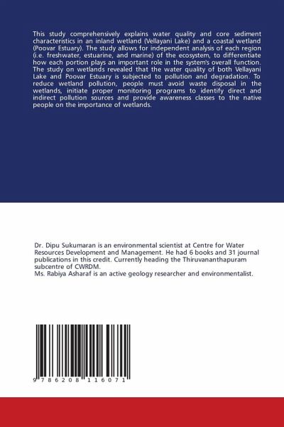 This study comprehensively explains water quality and core sediment characteristics in an inland wetland (Vellayani Lake) and a coastal wetland (Poovar Estuary). The study allows for independent analysis of each region (i.e. freshwater, estuarine, and marine) of the ecosystem, to differentiate how each portion plays an important role in the system's overall function. The study on wetlands revealed that the water quality of both Vellayani Lake and Poovar Estuary is subjected to pollution and degradation. To reduce wetland pollution, people must avoid waste disposal in the wetlands, initiate proper monitoring programs to identify direct and indirect pollution sources and provide awareness classes to the native people on the importance of wetlands.