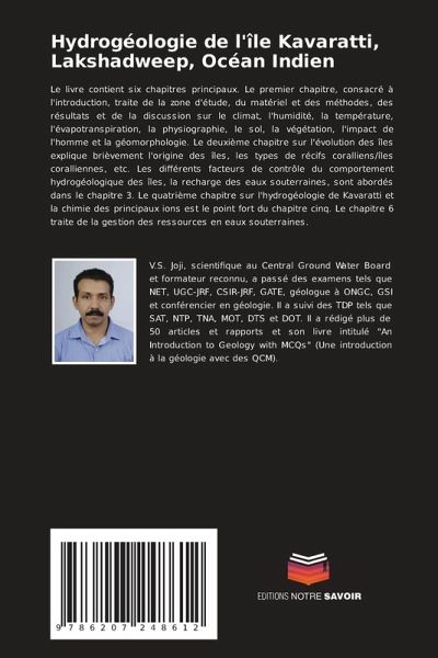 Le livre contient six chapitres principaux. Le premier chapitre, consacré à l'introduction, traite de la zone d'étude, du matériel et des méthodes, des résultats et de la discussion sur le climat, l'humidité, la température, l'évapotranspiration, la physiographie, le sol, la végétation, l'impact de l'homme et la géomorphologie. Le deuxième chapitre sur l'évolution des îles explique brièvement l'origine des îles, les types de récifs coralliens/îles coralliennes, etc. Les différents facteurs de contrôle du comportement hydrogéologique des îles, la recharge des eaux souterraines, sont abordés dans le chapitre 3. Le quatrième chapitre sur l'hydrogéologie de Kavaratti et la chimie des principaux ions est le point fort du chapitre cinq. Le chapitre 6 traite de la gestion des ressources en eaux souterraines.