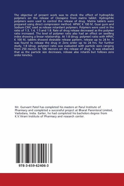 The objective of present work was to check the effect of hydrophilic polymers on the release of Clozapine from matrix tablet. Hydrophilic polymers were used to control the release of drug. Matrix tablets were prepared using direct compression method. HPMC K 100 M, Guar gum and Sodium CMC used as release retardant polymers. Polymers were used in the ratio of 1:3, 1:4, 1:5 and 1:8. Rate of drug release decreased as the polymer ratio increased. The level of polymer ratio also had an effect on swelling index showing a linear relationship. At 1:8 (drug: polymer) ratio with HPMC K 100 M, tablets showed desirable release pattern, release up to 24 hr. It was found to release the drug in Zero order up to 24 hrs. For further study, 1:8 (drug: polymer) ratio was evaluated with particle sizes ranging from 250 micron to 106 microns on the release of drug. It was observed that as the particle size decreases, release also retards but follows zero order kinetics.