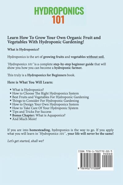 Learn The Basics of Hydroponics! How would you like to grow your own organic: - Fruits - Herbs - Vegetables With Hydroponics, you can! What is Hydroponics? Hydroponics is the art of growing fruits and vegetables without soil. Do not confuse this with Aquaponics, which is the science of farmed fishing and utilizing the fish's waste product as fuel for their hydroponics. Growing plants without soil is a rising trend among many in today's culture. It: - removes the dependency on soil, and - does away with the confusion of crop rotations, in order to preserve soil health and allowing it to rejuvenate after a harvest. Growing your own food with hydroponics is a wise investment. One that will yield many benefits! - You won't have to rely on other people's produce - You will know that the food you consume is free of chemicals And it can also be profitable: after buying your hydroponics system, you will recoup that investment by saving money (and time!) on groceries. You could even sell your fruits and vegetables and gain a profit! Why You Should Check Out 'Hydroponics 101' 'Hydroponics 101' is a complete step-by-step beginner guide that will show you how you can become a hydroponic farmer. This no-fluff Hydroponics Gardening Guide will teach you how to build and operate a hydroponic system. What's most important: I will take you by the hand and teach you everything you need to know about hydroponic farming. This truly is a book for beginners. Here is What You Will Learn: - What is Hydroponics? - How to Choose The Right Hydroponics System - Best Fruits and Vegetables For Hydroponic Gardening - Things to Consider For Hydroponic Gardening - How to Design Your Own Hydroponics System - How to Take Care Of Your Hydroponic System - Tips and Tricks For Success - And Much More! Finally, you'll also get the chapter 'What is Aquaponics?' from my other book 'Aquaponics 101.' To recap: If you apply what you will learn in 'Hydroponics 101', gardening will never be the same! So, let's get started, shall we?