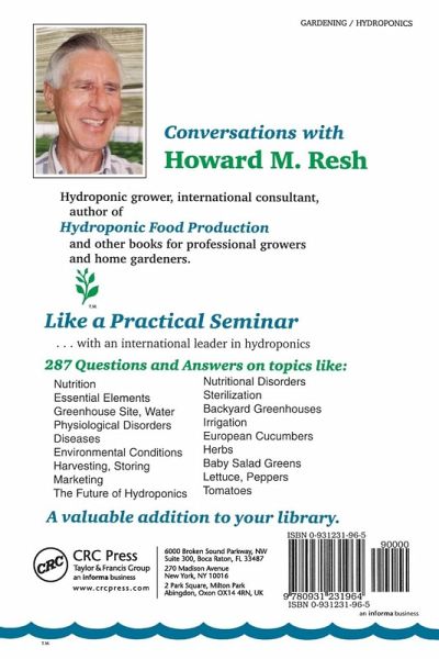 This book reviews many questions associated with hydroponic culture and offers useful suggestions. The questions relate to hydroponic systems, plant varieties, plant nutrition, plant culture, plant disease and pest management, environmental factors, optimum ranges, production and marketing.