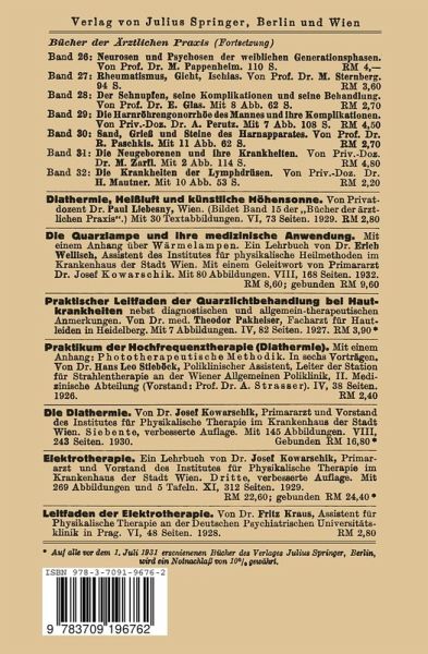 I. Geschichtliche Vorbemerkung.- II. Physikalische Grundlagen der Hydrotherapie.- 1. Einwirkung auf periphere Gefäße.- 2. Temperaturempfindung.- 3. Einwirkung auf das Herz- und Gefäßsystem.- 4. Einwirkung auf die Atmung.- 5. Einfluß auf den Wärmehaushalt.- 6. Einfluß auf das Blutbild.- 7. Einfluß auf die Sekretion und Exkretion.- 8. Einfluß auf das Nervensystem.- III. Hydrotherapeutische Methoden.- A. Wasseranwendungen in Wohnungen ohne Badezimmer.- B. Hydrotherapie in Wohnungen mit Badezimmer.- IV. Die wichtigsten Indikationen der Hydrotherapie.- 1. Bei Erkrankung der Atmungsorgane.- 2. Bei Erkrankung der Bewegungsorgane.- 3. Bei Erkrankung des Blutes.- 4. Bei Erkrankung des Digestionstraktes.- 5. Bei Erkrankung der Harn- und Geschlechtsorgane.- 6. Bei Erkrankung der Haut.- 7. Bei Erkrankung des zentralen und peripheren Nervensystems.- 8. Bei Erkrankung des Stoffwechsels.- 9. Bei Erkrankung der Zirkulationsorgane.- 10. Bei Infektionskrankheiten.