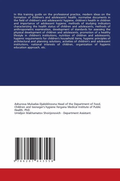 In this training guide on the professional practice, modern ideas on the formation of children's and adolescents' health, normative documents in the field of children's and adolescents' hygiene, children's health in children and importance of adolescent hygiene, methods of studying indicators characterizing the health status of children and adolescents, methods of anthropometric examination, development of standards for assessing the physical development of children and adolescents, promotion of a healthy lifestyle in children's institutions, nutrition of children and adolescents, hygienic requirements for children's household items, hygienic principles of architectural and planning solutions, activities of children's and adolescent institutions, national interests of children, organization of hygienic education approach, etc.