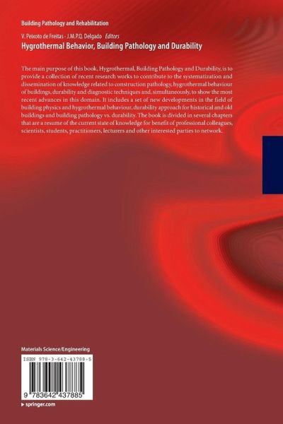 The main purpose of this book, Hygrothermal, Building Pathology and Durability, is to provide a collection of recent research works to contribute to the systematization and dissemination of knowledge related to construction pathology, hygrothermal behaviour of buildings, durability and diagnostic techniques and, simultaneously, to show the most recent advances in this domain. It includes a set of new developments in the field of building physics and hygrothermal behaviour, durability approach for historical and old buildings and building pathology vs. durability. The book is divided in several chapters that are a resume of the current state of knowledge for benefit of professional colleagues, scientists, students, practitioners, lecturers and other interested parties to network.