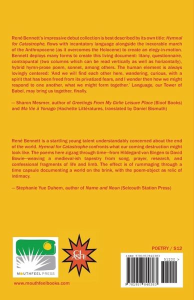 While hymns are traditionally means of communicating the divine, Hymnal for Catastrophe invests sacred forms in the ordinary and commonplace. Falling out of love, losing a friend, not having money to buy food: these things we experience all the time can often feel as profound and catastrophic as the end of the world. The manuscript is a blend of poetry and lyric essays that deal with these themes, elevating molecular catastrophes to the level of apocalypse. This is a chapbook collection by René Bennett.