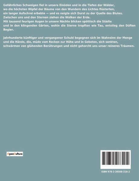 Gefährliches Schweigen fiel in unsere Einöden und in die Tiefen der Wälder, wo die höchsten Wipfel der Bäume von den Wundern des Lichtes flüsterten, ein langer Aufschrei erbebte ¿ und es neigte sich Durst zu der Quelle des Blutes. Zwischen uns und den Sternen ziehen die Wolken der Erde. Mit tausend feurigen Augen in unsere Nächte blicken spöttisch die Städte und in den klingenden Gärten, wohin die Sterne tropften wie Tau, entstieg den Düften Begier. Jahrhunderte künftiger und vergangener Schuld begegnen sich im Wahnsinn der Menge und die Hände, die, müde vom Recken zur Höhe und in Gebeten, sich senkten, schwärmen von glühenden Berührungen und nicht gehorcht uns unser reineres Träumen.
