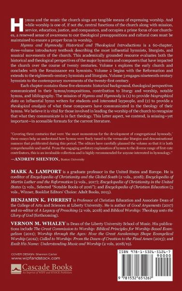 Hymns and the music the church sings in worship are tangible means of expressing worship. And while worship is one of, if not the central functions of the church along with mission, service, education, justice, and compassion, and occupies a prime focus of our churches, a renewed sense of awareness to our theological presuppositions and cultural cues must be maintained to ensure a proper focus in worship. Hymns and Hymnody: Historical and Theological Introductions is a sixty-chapter, three-volume introductory textbook describing the most influential hymnists, liturgists, and musical movements of the church. This academically grounded resource evaluates both the historical and theological perspectives of the major hymnists and composers who have impacted the church over the course of twenty centuries. Volume 1 explores the early church and concludes with the Renaissance era hymnists. Volume 2 begins with the Reformation and extends to the eighteenth-century hymnists and liturgists. Volume 3 engages nineteenth century hymnists to the contemporary movements of the twenty-first century. Each chapter contains these five elements: historical background, theological perspectives communicated in their hymns/compositions, contribution to liturgy and worship, notable hymns, and bibliography. The mission of Hymns and Hymnody is (1) to provide biographical data on influential hymn writers for students and interested laypeople, and (2) to provide a theological analysis of what these composers have communicated in the theology of their hymns. We believe it is vital for those involved in leading the worship of the church to recognize that what they communicate is in fact theology. This latter aspect, we contend, is missing--yet important--in accessible formats for the current literature.