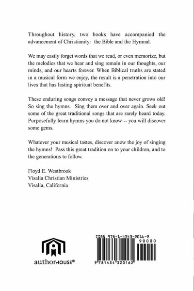 Throughout history, two books have accompanied the advancement of Christianity: the Bible and the Hymnal. We may easily forget words that we read, or even memorize, but the melodies that we hear and sing remain in our thoughts, our minds, and our hearts forever. When Biblical truths are stated in a musical form we enjoy, the result is a penetration into our lives that has lasting spiritual benefits. These enduring songs convey a message that never grows old! So sing the hymns. Sing them over and over again. Seek out some of the great traditional songs that are rarely heard today. Purposefully learn hymns you do not know -- you will discover some gems. Whatever your musical tastes, discover anew the joy of singing the hymns! Pass this great tradition on to your children, and to the generations to follow.