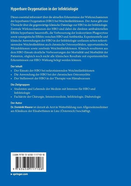 Dieses essential informiert über die aktuellen Erkenntnisse der Wirkmechanismen der hyperbaren Oxygenation (HBO) bei Weichteilinfektionen. Der Autor gibt eine Übersicht über die gegenwärtige klinische Datenlage zur HBO in der Infektiologie. Zentrale Wirkmechanismen der HBO sind dabei die direkten antibakteriellen Effekte hyperbaren Sauerstoffs, die Verbesserung der leukozytären Phagozytose sowie synergistische Effekte zwischen HBO und Antibiotika. Experimentelle und klinische Anwendungen der HBO in der Infektiologie umfassen neben nekrotisierenden Weichteilinfekten auch chronische Osteomyelitiden, opportunistische Pilzinfektionen sowie zerebrale Weichteilinfektionen. Klinisch resultieren aus dem HBO-Einsatz deutliche Verbesserungen der Mortalität und Morbidität der Patienten, obgleich noch nicht alle klinischen Resultate mit experimentellen Erkenntnissen zur HBO-Wirkung belegt werden können.
