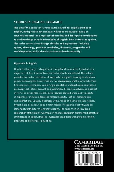 Non-literal language is ubiquitous in everyday life, and while hyperbole is a major part of this, it has so far remained relatively unexplored. This volume provides the first investigation of hyperbole in English, drawing on data from genres such as spoken conversation, TV, newspapers, and literary works from Chaucer to Monty Python. Combining quantitative and qualitative analyses, it uses approaches from semantics, pragmatics, discourse analysis and classical rhetoric to investigate in detail both speaker-centered and emotive aspects of hyperbole, and also addressee-related aspects, such as interpretation and interactional uptake. Illustrated with a range of diachronic case studies, hyperbole is also shown to be a main means of linguistic creativity, and an important contributor to language change. The book concludes with an exploration of the role of hyperbole in political speaking, humour, and literature. Original and in-depth, it will be invaluable to all those working on meaning, discourse, and historical linguistics.