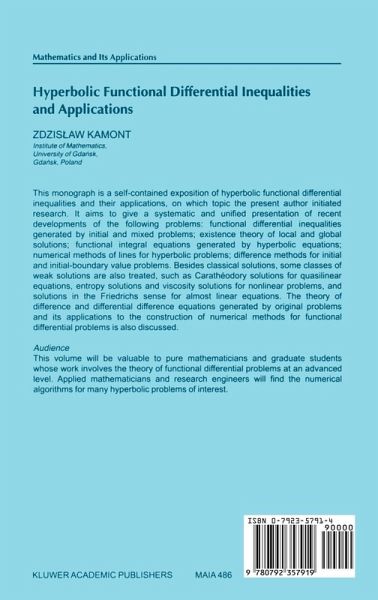 This book is intended as a self-contained exposition of hyperbolic functional dif ferential inequalities and their applications. Its aim is to give a systematic and unified presentation of recent developments of the following problems: (i) functional differential inequalities generated by initial and mixed problems, (ii) existence theory of local and global solutions, (iii) functional integral equations generated by hyperbolic equations, (iv) numerical method of lines for hyperbolic problems, (v) difference methods for initial and initial-boundary value problems. Beside classical solutions, the following classes of weak solutions are treated: Ca ratheodory solutions for quasilinear equations, entropy solutions and viscosity so lutions for nonlinear problems and solutions in the Friedrichs sense for almost linear equations. The theory of difference and differential difference equations ge nerated by original problems is discussed and its applications to the constructions of numerical methods for functional differential problems are presented. The monograph is intended for different groups of scientists. Pure mathemati cians and graduate students will find an advanced theory of functional differential problems. Applied mathematicians and research engineers will find numerical al gorithms for many hyperbolic problems. The classical theory of partial differential inequalities has been described exten sively in the monographs [138, 140, 195, 225). As is well known, they found applica tions in differential problems. The basic examples of such questions are: estimates of solutions of partial equations, estimates of the domain of the existence of solu tions, criteria of uniqueness and estimates of the error of approximate solutions.