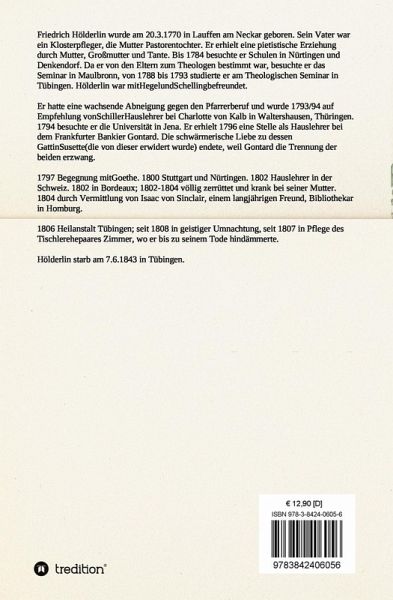 Johann Christian Friedrich Hölderlin wurde am 20. März 1770 in Lauffen am Neckar geboren. Nach dem frühen Tod des Vaters und des Stiefvaters besuchte er in seiner Jugend eine Klosterschule, ab 1778 begann er am Tübinger Stift ein Theologiestudium. Dort lernte er Hegel, Schelling und Isaac von Sinclair kennen, mit denen ihn bald schon eine enge Freundschaft verband. Einige Jahre später traf er auch auf Goethe und Schiller, wobei er besonders in Schiller einen Gönner und Berater für seine dichterische Tätigkeit fand. Ab 1791 veröffentlichte er erste Gedichte und arbeitete als Hofmeister in Walterhausen, Frankfurt und Hauptwil. Von dort musste er allerdings nach der Entdeckung seiner Liebesaffäre mit der Hausherrin Susette Gotard nach Bordeaux reisen. Er kehrte aber bald schon wegen einer Nervenerkrankung ins Haus seiner Mutter nach Nürtingen, später zu Isaac von Sinclair zurück. Nach der Nachricht vom Tod seiner Geliebten Susette verschlimmerte sich sein Leiden, so dass Hölderlin in