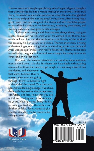 Thomas ventures through a perplexing web of hyperreligious thoughts that ultimately lead him to a mental institution three times. In this true story, Thomas takes you on his personal journey of how his thoughts led him astray and put him in many peculiar situations. After having lost a great career, and now living out of his truck and with charitable people on occasion, he continues to deteriorate, wandering the streets, and sleeping on benches and grass or below bridges. God was not through with him and was always there, trying to reach Thomas with his still, small voice. He wanted to tell Thomas how much he loved him and the implications and finality of the work of the cross by his Son Jesus. In this book, Thomas shows how a wrong understanding of our loving Father and exalting works over faith and grace was a recipe for disaster in his life. Ultimately, Thomas came back to reality by the grace of God and lives a happy life today back in his career and on his feet again. This book is for anyone interested in a true story about extreme mental conditions. It is also for those that have dealt with puzzling issues in life, those that seem to get caught in a spinning wheel of dos and don'ts, and whosoever that wants to know that no matter what you are going through, there is a beautiful light at the end of the tunnel. Your mess can become a redeeming message. If you have dealt with depression, discouragement, confusion, and loss, know that you are not alone. Healing and restoration can be yours. Never give up. Every life has an ending untold, and the author and finisher of faith, Jesus, wants to give you the abundant life he came to die to impart to us.