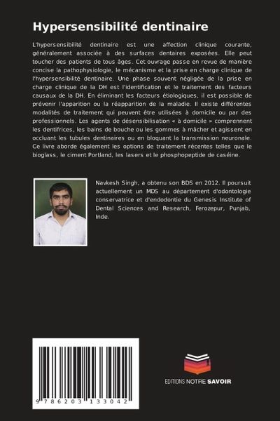 L'hypersensibilité dentinaire est une affection clinique courante, généralement associée à des surfaces dentaires exposées. Elle peut toucher des patients de tous âges. Cet ouvrage passe en revue de manière concise la pathophysiologie, le mécanisme et la prise en charge clinique de l'hypersensibilité dentinaire. Une phase souvent négligée de la prise en charge clinique de la DH est l'identification et le traitement des facteurs causaux de la DH. En éliminant les facteurs étiologiques, il est possible de prévenir l'apparition ou la réapparition de la maladie. Il existe différentes modalités de traitement qui peuvent être utilisées à domicile ou par des professionnels. Les agents de désensibilisation « à domicile » comprennent les dentifrices, les bains de bouche ou les gommes à mâcher et agissent en occluant les tubules dentinaires ou en bloquant la transmission neuronale. Ce livre aborde également les options de traitement récentes telles que le bioglass, le ciment Portland, les lasers et le phosphopeptide de caséine.