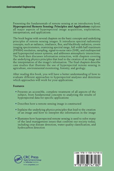The book begins with several chapters on the basic concepts and underlying principles of remote sensing images. It introduces spectral radiometry concepts, such as radiance, irradiance, flux, and blackbody radiation; covers imaging spectrometers, examining spectral range, full width half maximum (FWHM), resolution, sampling, signal-to-noise ratio (SNR), and multispectral and hyperspectral sensor systems; and addresses atmospheric interactions. The book then discusses information extraction, with chapters covering the underlying physics principles that lead to the creation of an image and the interpretation of the image's information. The final chapters describe case studies that illustrate the use of hyperspectral remote sensing in agriculture, environmental monitoring, forestry, and geology.