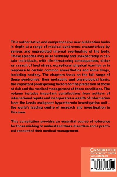 This authoritative and comprehensive 1996 publication looks in depth at a range of medical syndromes characterised by serious and unpredicted internal overheating of the body. These episodes may arise suddenly and unexpectedly in certain individuals, with life-threatening consequences, either as a result of heat stress, exceptional physical exertion or in response to certain common anaesthetics and some drugs, including ecstasy. The chapters focus on the full range of these syndromes, their metabolic and physiological basis, the important pre-disposing factors for the prediction of those at risk, and the medical management of these conditions. The volume includes important contributions from authors of international repute and incorporates a wealth of information from the Leeds malignant hyperthermia investigation unit. This compilation will be of interest to those wanting to understand these disorders.