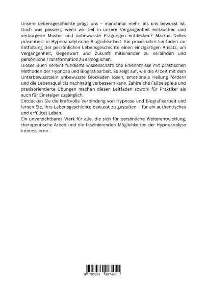 Unsere Lebensgeschichte prägt uns - manchmal mehr, als uns bewusst ist. Doch was passiert, wenn wir tief in unsere Vergangenheit eintauchen und verborgene Muster und unbewusste Prägungen entdecken? Markus Nelles präsentiert in Hypnoanalytische Biografiearbeit: Ein praxisnaher Leitfaden zur Entfaltung der persönlichen Lebensgeschichte einen einzigartigen Ansatz, um Vergangenheit, Gegenwart und Zukunft miteinander zu verbinden und persönliche Transformation zu ermöglichen.Dieses Buch vereint fundierte wissenschaftliche Erkenntnisse mit praktischen Methoden der Hypnose und Biografiearbeit. Es zeigt auf, wie die Arbeit mit dem Unterbewusstsein unbewusste Blockaden lösen, emotionale Heilung fördern und die Lebensqualität nachhaltig verbessern kann. Zahlreiche Fallbeispiele und praxisorientierte Übungen machen diesen Leitfaden sowohl für Praktiker als auch für Einsteiger zugänglich.Entdecken Sie die kraftvolle Verbindung von Hypnose und Biografiearbeit und lernen Sie, Ihre Lebensgeschichte bewusst zu gestalten - für ein authentisches und erfülltes Leben.Ein unverzichtbares Werk für alle, die sich für persönliche Weiterentwicklung, therapeutische Arbeit und die faszinierenden Möglichkeiten der Hypnoanalyse interessieren.