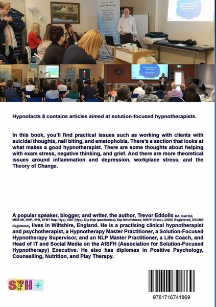 Hypnofacts 8 contains various articles for hypnotherapists covering practical issues such as working with clients with suicidal thoughts, nail biting, and emetophobia. There's a section that looks at what makes a good hypnotherapist. There are some thoughts about helping with exam stress, negative thinking, and grief. And there are more theoretical issues around inflammation and depression, workplace stress, and the Theory of Change. Again, the articles assume a model of the brain in which core activities (such as telling the heart to beat) are handled by the brain stem; more protective functions (such as fighting, fleeing, feeding, and reproductive behaviour) are handled by the primitive emotional brain; and higher functions (such as problem solving, maintaining attention, and controlling emotional impulses from the primitive brain) are handled by the intellectual brain. In terms of physical parts of the brain, these three areas more-or-less match up to the brain stem and cerebellum, the limbic system, and the cerebral cortex. It also assumes that the primitive emotional brain is very fast and the intellectual brain is much slower and tends to be used less. In addition, the book assumes that the mind and body make up a single functioning system that is affected by each component and the environment they are in. And it assumes a solution-focused model for hypnotherapy - moving clients towards their desired goals rather than worrying about the problem itself and its origin.