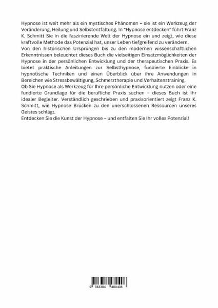 Hypnose ist weit mehr als ein mystisches Phänomen - sie ist ein Werkzeug der Veränderung, Heilung und Selbstentfaltung. In "Hypnose entdecken" führt Franz K. Schmitt Sie in die faszinierende Welt der Hypnose ein und zeigt, wie diese kraftvolle Methode das Potenzial hat, unser Leben tiefgreifend zu verändern.Von den historischen Ursprüngen bis zu den modernen wissenschaftlichen Erkenntnissen beleuchtet dieses Buch die vielseitigen Einsatzmöglichkeiten der Hypnose in der persönlichen Entwicklung und der therapeutischen Praxis. Es bietet praktische Anleitungen zur Selbsthypnose, fundierte Einblicke in hypnotische Techniken und einen Überblick über ihre Anwendungen in Bereichen wie Stressbewältigung, Schmerztherapie und Verhaltenstraining.Ob Sie Hypnose als Werkzeug für Ihre persönliche Entwicklung nutzen oder eine fundierte Grundlage für die berufliche Praxis suchen - dieses Buch ist Ihr idealer Begleiter. Verständlich geschrieben und praxisorientiert zeigt Franz K. Schmitt, wie Hypnose Brücken zu den unerschlossenen Ressourcen unseres Geistes schlägt.