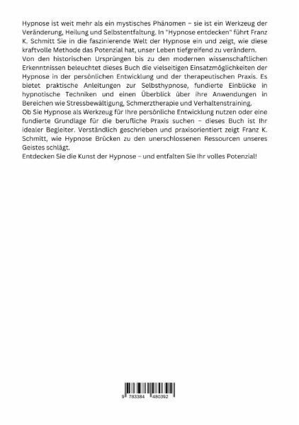 Hypnose ist weit mehr als ein mystisches Phänomen - sie ist ein Werkzeug der Veränderung, Heilung und Selbstentfaltung. In "Hypnose entdecken" führt Franz K. Schmitt Sie in die faszinierende Welt der Hypnose ein und zeigt, wie diese kraftvolle Methode das Potenzial hat, unser Leben tiefgreifend zu verändern.Von den historischen Ursprüngen bis zu den modernen wissenschaftlichen Erkenntnissen beleuchtet dieses Buch die vielseitigen Einsatzmöglichkeiten der Hypnose in der persönlichen Entwicklung und der therapeutischen Praxis. Es bietet praktische Anleitungen zur Selbsthypnose, fundierte Einblicke in hypnotische Techniken und einen Überblick über ihre Anwendungen in Bereichen wie Stressbewältigung, Schmerztherapie und Verhaltenstraining.Ob Sie Hypnose als Werkzeug für Ihre persönliche Entwicklung nutzen oder eine fundierte Grundlage für die berufliche Praxis suchen - dieses Buch ist Ihr idealer Begleiter. Verständlich geschrieben und praxisorientiert zeigt Franz K. Schmitt, wie Hypnose Brücken zu den unerschlossenen Ressourcen unseres Geistes schlägt.