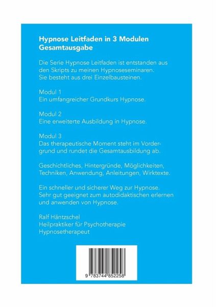 Die Serie Hypnose Leitfaden ist entstanden aus den Skripts zu meinen Hypnoseseminaren.Sie besteht aus drei Einzelbausteinen.Modul 1Ein umfangreicher Grundkurs Hypnose.Modul 2Eine erweiterte Ausbildung in Hypnose.Modul 3Das therapeutische Moment steht hier im Vordergrund und rundet die Gesamtausbildung ab. Im Seminar vor Ort schließt dieses Modul mit der Prüfung zum Hypnotherapeut / Hypnos.esslingen ab.Geschichtliches, Hintergründe, Möglichkeiten, Techniken, Anwendung, Anleitungen, Wirktexte ...Ein schneller und sicherer Weg, auch zum autodidaktischen erlernen und anwenden von Hypnose.Ralf HäntzschelHeilpraktiker für PsychotherapieHypnosetherapeut
