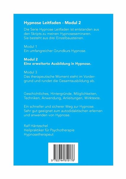 Die Serie Hypnose Leitfaden ist entstanden aus den Skripts zu meinen Hypnoseseminaren.Sie besteht aus drei Einzelbausteinen.Modul 1Ein umfangreicher Grundkurs Hypnose.Modul 2Eine erweiterte Ausbildung in Hypnose.Modul 3Das therapeutische Moment steht hier im Vordergrund und rundet die Gesamtausbildung ab. Im Seminar vor Ort schließt dieses Modul mit der Prüfung zum Hypnotherapeut / Hypnos.esslingen ab.Geschichtliches, Hintergründe, Möglichkeiten, Techniken, Anwendung, Anleitungen, Wirktexte ...Ein schneller und sicherer Weg, auch zum autodidaktischen erlernen und anwenden von Hypnose.