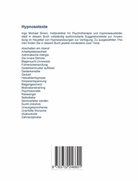 Dieses Buch ist der dritte Band der Reihe Hypnosetexte. Jeder Band enthält fünfzig vollständig ausformulierte Hypnosehauptteile zu interessanten und in Hypnosepraxen häufig behandelten Themen und Problemen. Viele Hypnotiseurinnen und Hypnotiseure haben ihre routinierten oder speziellen Einleitungs- und Vertiefungswege, oft auch alternative Tranceführung mit Hilfe von Trommeln, Gongschlägen oder Atemtechniken. Die Texte dieses Buches können problemlos als Hauptteile in jede Form von Hypnose eingebaut werden, da der Weg in die Trance und wieder zurück zum tageswachen Zustand beliebig ergänzt werden können. Das Buch enthält jeweils mindestens zwei Hauptteile pro Thema. Es kommen sowohl klassische Suggestionstexte als auch kreative Visualisierungen, ideomotorische Elemente und Fantasiereisen vor, um der Vielfalt der Möglichkeiten und Bedürfnisse der Praxis möglichst gerecht zu werden. Behandelte Themen: Abschalten am Feierabend, Arbeitsplatzwechsel, Allergie, Essstörung (Anorexie), Führerscheinprüfung, Gedankenmuster auflösen, Gedankenstille, Geduld, Heilzahlenhypnose, Körperentspannung, Magengeschwür, Motivationstraining, Psychosomatik, Reiseangst, Selbstliebe, Seminarleiter werden, Sucht (Alkohol), Unausgesprochenes, unerfüllte Wünsche, Wutkontrolle, Zahnarztphobie.