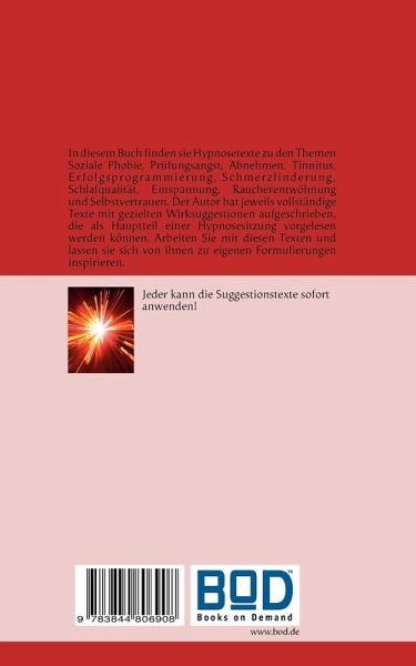 In diesem Buch finden sie Hypnosetexte (Suggestionstexte)zu den Themen Soziale Phobie, Prüfungsangst, Abnehmen, Tinnitus, Erfolgsprogrammierung, Schmerzlinderung, Schlafqualität, Entspannung, Raucherentwöhnung und Selbstvertrauen. Der Autor hat jeweils vollständige Texte mit gezielten Wirksuggestionen aufgeschrieben, die als Hauptteil einer Hypnosesitzung vorgelesen werden können. Arbeiten Sie mit diesen Texten und lassen sie sich von ihnen auch zu eigenen Formulierungen inspirieren. Jeder kann die Suggestionstexte sofort anwenden!