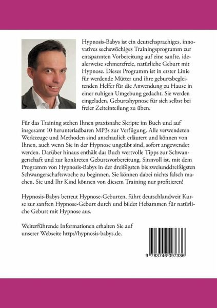 Hypnosis-Babys ist ein deutschsprachiges, innovatives sechswöchiges Trainingsprogramm zur entspannten Vorbereitung auf eine sanfte, idealerweise schmerzfreie, natürliche Geburt mit Hypnose. Dieses Programm ist in erster Linie für werdende Mütter und ihre geburtsbegleitenden Helfer für die Anwendung zu Hause in einer ruhigen Umgebung gedacht. Sie werden eingeladen, Geburtshypnose für sich selbst bei freier Zeiteinteilung zu üben. Für das Training stehen Ihnen praxisnahe Skripte im Buch und auf insgesamt 10 herunterladbaren MP3s zur Verfügung. Alle verwendeten Werkzeuge und Methoden sind anschaulich erläutert und können von Ihnen, auch wenn Sie in der Hypnose ungeübt sind, sofort angewendet werden. Darüber hinaus enthält das Buch wertvolle Tipps zur Schwangerschaft und zur konkreten Geburtsvorbereitung. Sinnvoll ist, mit dem Programm von Hypnosis-Babys in der dreißigsten bis zweiunddreißigsten Schwangerschaftswoche zu beginnen. Sie können dabei nichts falsch machen. Sie und Ihr Kind können von diesem Training nur profitieren! Hypnosis-Babys betreut Hypnose-Geburten, führt deutschlandweit Kurse zur sanften Hypnose-Geburt durch und bildet Hebammen für natürliche Geburt mit Hypnose aus. Weiterführende Informationen erhalten Sie aufunserer Webseite http://hypnosis-babys.de.