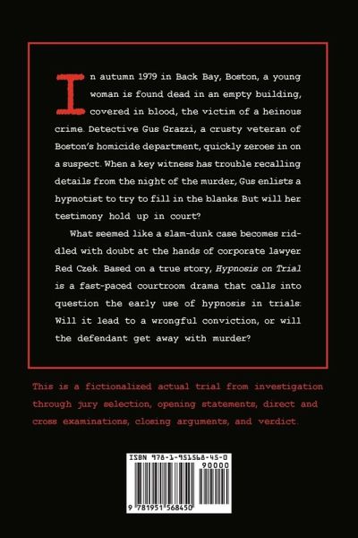 This is a fictionalized account of an actual trial from investigation through jury selection, opening statements, direct and cross examinations, closing arguments, and verdict. In autumn 1979 in Back Bay, Boston, a young woman is found dead in an empty building, covered in blood, the victim of a heinous crime. Detective Gus Grazzi, a crusty veteran of Boston's homicide department, quickly zeroes in on a suspect. When a key witness has trouble recalling details from the night of the murder, Gus enlists a hypnotist to try to fill in the blanks. But will her testimony hold up in court? What seemed like a slam-dunk case becomes riddled with doubt at the hands of corporate lawyer Red Czek. Based on a true story, Hypnosis on Trial is a fast-paced courtroom drama that calls into question the early use of hypnosis in trials: Will it lead to a wrongful conviction, or will the defendant get away with murder?